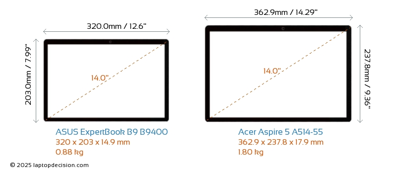 USBBoth ExpertBook B9 B9400 and Aspire 5 A514-55 have USB-A ports. ExpertBook B9 B9400 has 1x USB 3.2 USB-A ports, while Aspire 5 A514-55 has 3x USB 3.2 USB-A ports.Both ExpertBook B9 B9400 and Aspire 5 A514-55 have USB Type-C ports. ExpertBook B9 B9400 has 2x USB 3.2 USB Type-C ports, while Aspire 5 A514-55 has 1x USB 3.2 USB Type-C ports.