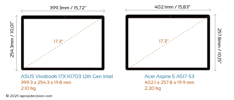 USBBoth Vivobook 17X K1703 12th Gen Intel and Aspire 5 A517-53 have USB-A ports. Vivobook 17X K1703 12th Gen Intel has 2x USB 3.2 USB-A ports, while Aspire 5 A517-53 has 3x USB 3.2 USB-A ports.Both Vivobook 17X K1703 12th Gen Intel and Aspire 5 A517-53 feature 1x USB 3.2 USB Type-C ports.