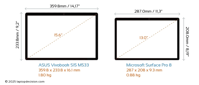 ThunderboltSurface Pro 8 is equipped with Thunderbolt 4 port. Vivobook S15 M533 does not have Thunderbolt port.
