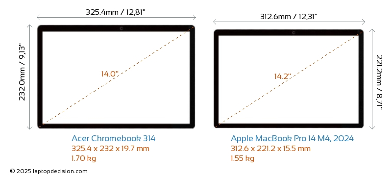 HDMIBoth Chromebook 314 and MacBook Pro 14 M4, 2024 feature an HDMI port. Chromebook 314 offers 1x HDMI 1.4, while MacBook Pro 14 M4, 2024 offers 1x HDMI 2.1.
