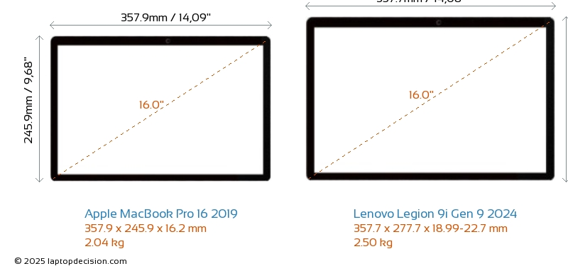 HDMI Legion 9i Gen 9 2024 features an HDMI port (1x HDMI 2.1) for connecting to external monitors. MacBook Pro 16 2019 does not have an HDMI port.