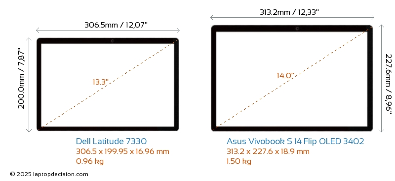 HDMIBoth Latitude 7330 and Vivobook S 14 Flip OLED 3402 feature an HDMI port. Latitude 7330 offers 1x HDMI 2.0, while Vivobook S 14 Flip OLED 3402 offers 1x HDMI 2.1.