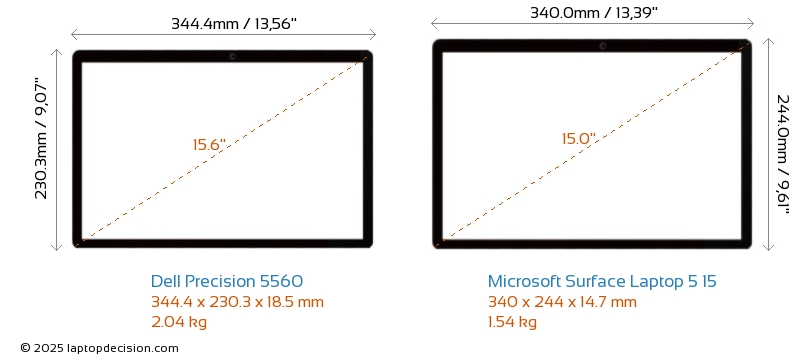 USB Surface Laptop 5 15 is equipped with 1x USB 3.1 USB-A ports. Precision 5560 does not have USB-A ports.Both Precision 5560 and Surface Laptop 5 15 have USB Type-C ports. Precision 5560 has 3x USB 3.2 USB Type-C ports, while Surface Laptop 5 15 has 1x USB 4.0 USB Type-C ports.