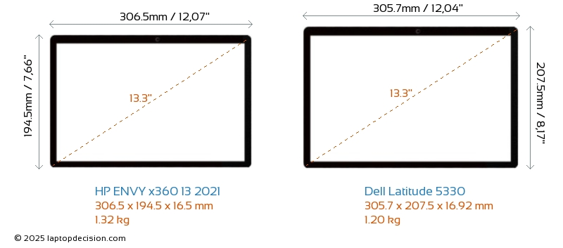 HDMILatitude 5330 features an HDMI port (1x HDMI 2.0) for connecting to external monitors. ENVY x360 13 2021 does not have an HDMI port.