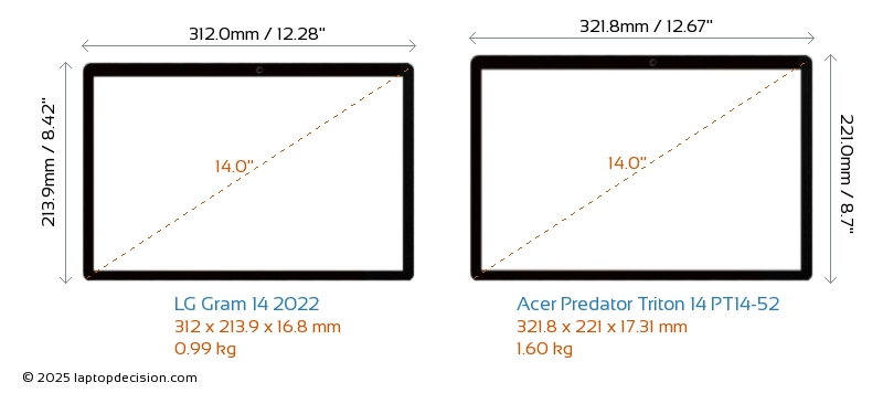 HDMIBoth Gram 14 2022 and Predator Triton 14 PT14-52 feature an HDMI port. Gram 14 2022 offers 1x HDMI 2.0, while Predator Triton 14 PT14-52 offers 1x HDMI 2.1.