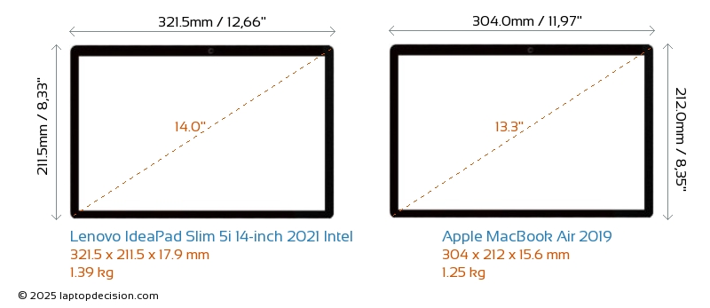 ThunderboltMacBook Air 2019 is equipped with Thunderbolt 3 port. IdeaPad Slim 5i 14-inch 2021 Intel does not have Thunderbolt port.