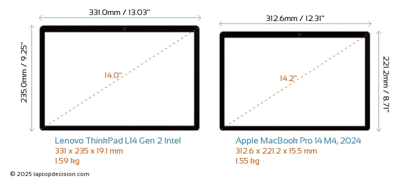 HDMIBoth ThinkPad L14 Gen 2 Intel and MacBook Pro 14 M4, 2024 feature an HDMI port. ThinkPad L14 Gen 2 Intel offers 1x HDMI 2.0, while MacBook Pro 14 M4, 2024 offers 1x HDMI 2.1.
