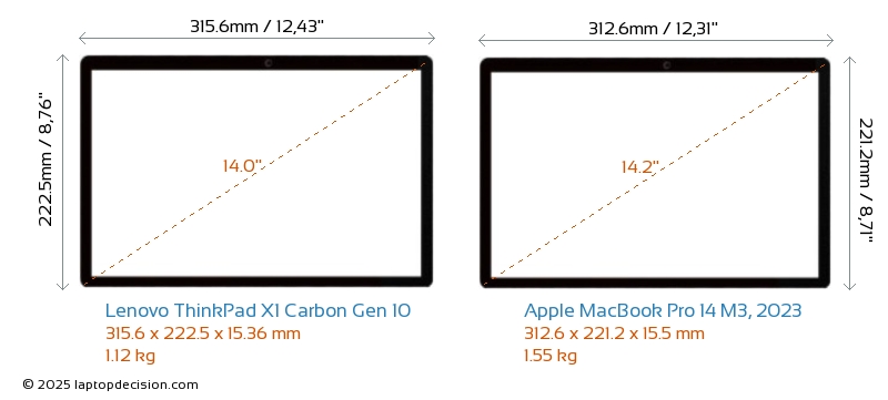 HDMIBoth ThinkPad X1 Carbon Gen 10 and MacBook Pro 14 M3, 2023 feature an HDMI port. ThinkPad X1 Carbon Gen 10 offers 1x HDMI 2.0, while MacBook Pro 14 M3, 2023 offers 1x HDMI 2.1.