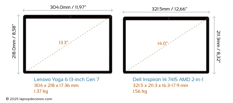 HDMIBoth Yoga 6 13-inch Gen 7 and Inspiron 14 7415 AMD 2-in-1 feature an HDMI port. Yoga 6 13-inch Gen 7 offers 1x HDMI 2.0, while Inspiron 14 7415 AMD 2-in-1 offers 1x HDMI 1.4.