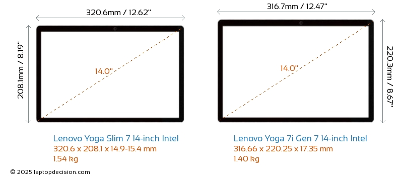 USBBoth Yoga Slim 7 14-inch Intel and Yoga 7i Gen 7 14-inch Intel have USB-A ports. Yoga Slim 7 14-inch Intel has 2x USB 3.1 USB-A ports, while Yoga 7i Gen 7 14-inch Intel has 1x USB 3.2 USB-A ports.Both Yoga Slim 7 14-inch Intel and Yoga 7i Gen 7 14-inch Intel have USB Type-C ports. Yoga Slim 7 14-inch Intel has 2x USB 3.1 USB Type-C ports, while Yoga 7i Gen 7 14-inch Intel has 2x USB 3.2 USB Type-C ports.