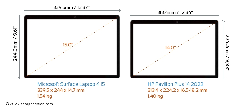 HDMI Pavilion Plus 14 2022 features an HDMI port (1x HDMI 2.0) for connecting to external monitors. Surface Laptop 4 15 does not have an HDMI port.