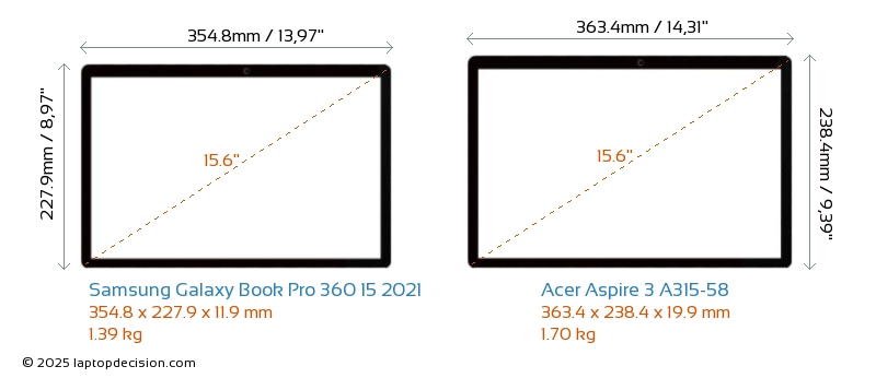 ThunderboltGalaxy Book Pro 360 15 2021 is equipped with Thunderbolt 4 port. Aspire 3 A315-58 does not have Thunderbolt port.