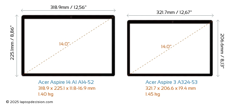 HDMIBoth Aspire 14 AI A14-52 and Aspire 3 A324-53 feature an HDMI port. Aspire 14 AI A14-52 offers 1x HDMI 2.1, while Aspire 3 A324-53 offers 1x HDMI 1.4.