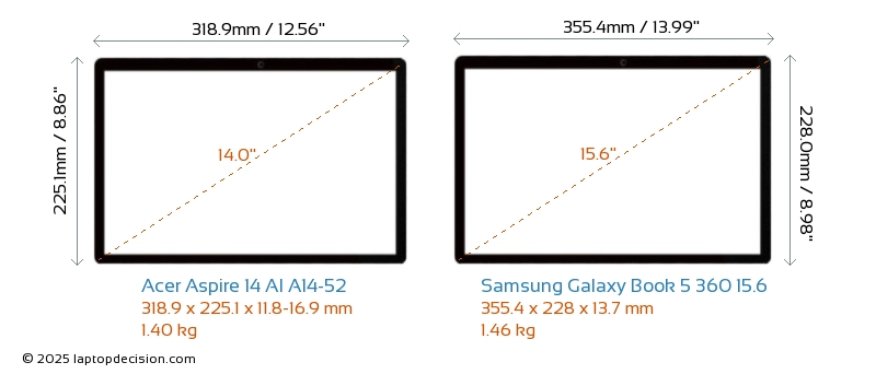 SD Card Reader Galaxy Book 5 360 15.6 is equipped with an SD Card Reader for easy access to memory cards. Aspire 14 AI A14-52 does not have an SD Card Reader.