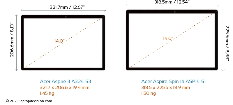 HDMIBoth Aspire 3 A324-53 and Aspire Spin 14 ASP14-51 feature an HDMI port. Aspire 3 A324-53 offers 1x HDMI 1.4, while Aspire Spin 14 ASP14-51 offers 1x HDMI 2.1.