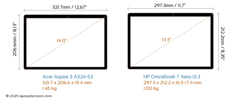 HDMIBoth Aspire 3 A324-53 and OmniBook 7 Aero 13.3 feature an HDMI port. Aspire 3 A324-53 offers 1x HDMI 1.4, while OmniBook 7 Aero 13.3 offers 1x HDMI 2.1.