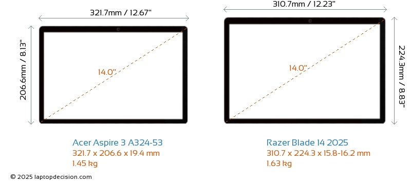 SD Card Reader Blade 14 2025 is equipped with an SD Card Reader for easy access to memory cards. Aspire 3 A324-53 does not have an SD Card Reader.