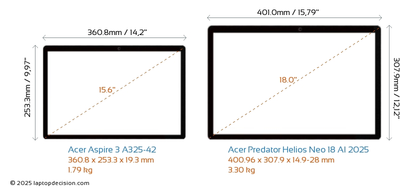 USBBoth Aspire 3 A325-42 and Predator Helios Neo 18 AI 2025 have USB-A ports. Aspire 3 A325-42 has 2x USB 3.2 USB-A ports, while Predator Helios Neo 18 AI 2025 has 4x USB 3.2 USB-A ports.Both Aspire 3 A325-42 and Predator Helios Neo 18 AI 2025 have USB Type-C ports. Aspire 3 A325-42 has 2x USB 3.2 USB Type-C ports, while Predator Helios Neo 18 AI 2025 has 2x USB 4.0 USB Type-C ports.