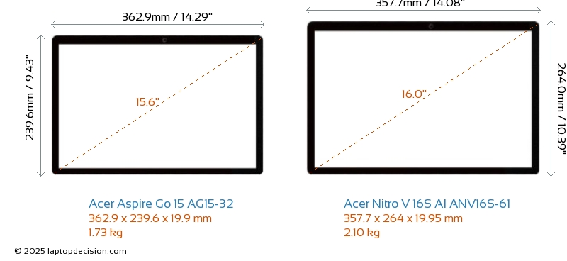 USBBoth Aspire Go 15 AG15-32 and Nitro V 16S AI ANV16S-61 have USB-A ports. Aspire Go 15 AG15-32 has 2x USB 3.2 USB-A ports, while Nitro V 16S AI ANV16S-61 has 3x USB 3.2 USB-A ports.Both Aspire Go 15 AG15-32 and Nitro V 16S AI ANV16S-61 have USB Type-C ports. Aspire Go 15 AG15-32 has 2x USB 3.2 USB Type-C ports, while Nitro V 16S AI ANV16S-61 has 2x USB 4.0 USB Type-C ports.