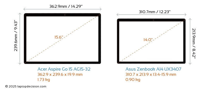USBBoth Aspire Go 15 AG15-32 and Zenbook A14 UX3407 have USB-A ports. Aspire Go 15 AG15-32 has 2x USB 3.2 USB-A ports, while Zenbook A14 UX3407 has 1x USB 3.2 USB-A ports.Both Aspire Go 15 AG15-32 and Zenbook A14 UX3407 have USB Type-C ports. Aspire Go 15 AG15-32 has 2x USB 3.2 USB Type-C ports, while Zenbook A14 UX3407 has 2x USB 4.0 USB Type-C ports.