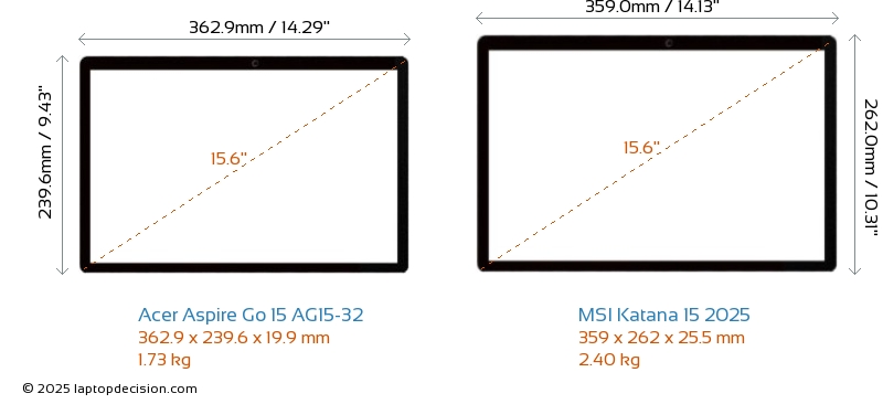 USBBoth Aspire Go 15 AG15-32 and Katana 15 2025 have USB-A ports. Aspire Go 15 AG15-32 has 2x USB 3.2 USB-A ports, while Katana 15 2025 has 3x USB 3.2 USB-A ports.Both Aspire Go 15 AG15-32 and Katana 15 2025 have USB Type-C ports. Aspire Go 15 AG15-32 has 2x USB 3.2 USB Type-C ports, while Katana 15 2025 has 1x USB 3.2 USB Type-C ports.