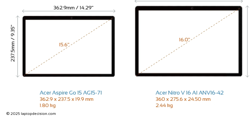 USBBoth Aspire Go 15 AG15-71 and Nitro V 16 AI ANV16-42 have USB-A ports. Aspire Go 15 AG15-71 has 2x USB 3.2 USB-A ports, while Nitro V 16 AI ANV16-42 has 3x USB 3.2 USB-A ports.Both Aspire Go 15 AG15-71 and Nitro V 16 AI ANV16-42 have USB Type-C ports. Aspire Go 15 AG15-71 has 2x USB 3.2 USB Type-C ports, while Nitro V 16 AI ANV16-42 has 1x USB 4.0 USB Type-C ports.