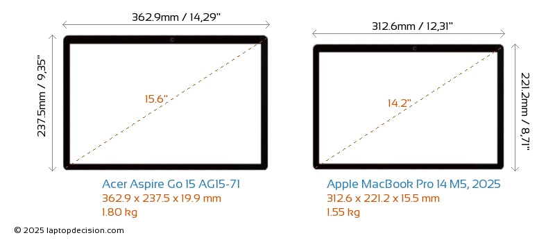 HDMIBoth Aspire Go 15 AG15-71 and MacBook Pro 14 M5, 2025 feature an HDMI port (1x HDMI 2.1) for connecting to external monitors.