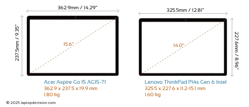 HDMIBoth Aspire Go 15 AG15-71 and ThinkPad P14s Gen 6 Intel feature an HDMI port (1x HDMI 2.1) for connecting to external monitors.