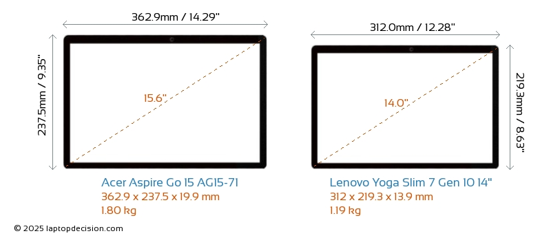 SD Card Reader Yoga Slim 7 Gen 10 14" is equipped with an SD Card Reader for easy access to memory cards. Aspire Go 15 AG15-71 does not have an SD Card Reader.