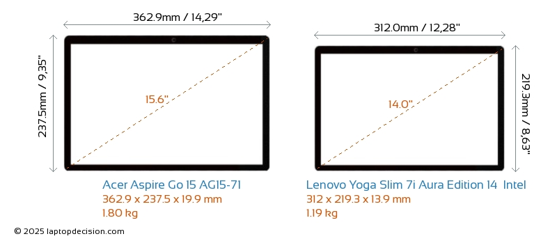 Thunderbolt Yoga Slim 7i Aura Edition 14 Intel is equipped with Thunderbolt 4 port. Aspire Go 15 AG15-71 does not have Thunderbolt port.