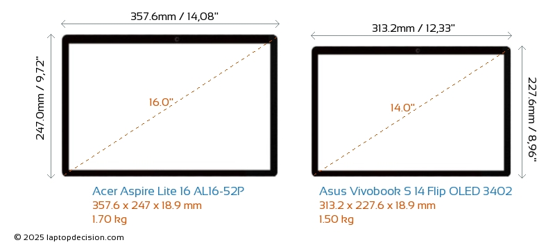 HDMIBoth Aspire Lite 16 AL16-52P and Vivobook S 14 Flip OLED 3402 feature an HDMI port. Aspire Lite 16 AL16-52P offers 1x HDMI 1.4, while Vivobook S 14 Flip OLED 3402 offers 1x HDMI 2.1.