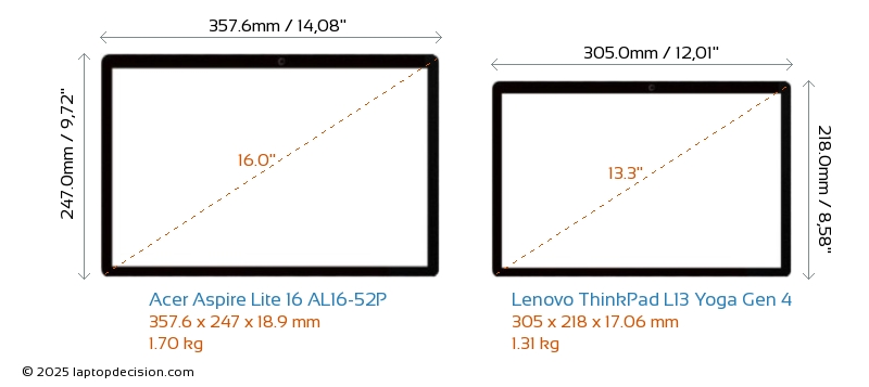 HDMIBoth Aspire Lite 16 AL16-52P and ThinkPad L13 Yoga Gen 4 feature an HDMI port. Aspire Lite 16 AL16-52P offers 1x HDMI 1.4, while ThinkPad L13 Yoga Gen 4 offers 1x HDMI 2.0.