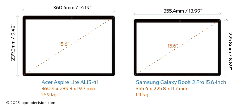 HDMIBoth Aspire Lite AL15-41 and Galaxy Book 2 Pro 15.6-inch feature an HDMI port. Aspire Lite AL15-41 offers 1x HDMI 1.4, while Galaxy Book 2 Pro 15.6-inch offers 1x HDMI 2.0.