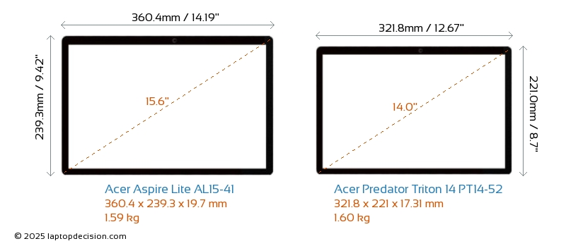 USBBoth Aspire Lite AL15-41 and Predator Triton 14 PT14-52 have USB-A ports. Aspire Lite AL15-41 has 3x USB 3.2 USB-A ports, while Predator Triton 14 PT14-52 has 2x USB 3.2 USB-A ports.Both Aspire Lite AL15-41 and Predator Triton 14 PT14-52 have USB Type-C ports. Aspire Lite AL15-41 has 1x USB 3.2 USB Type-C ports, while Predator Triton 14 PT14-52 has 2x USB 3.2 USB Type-C ports.