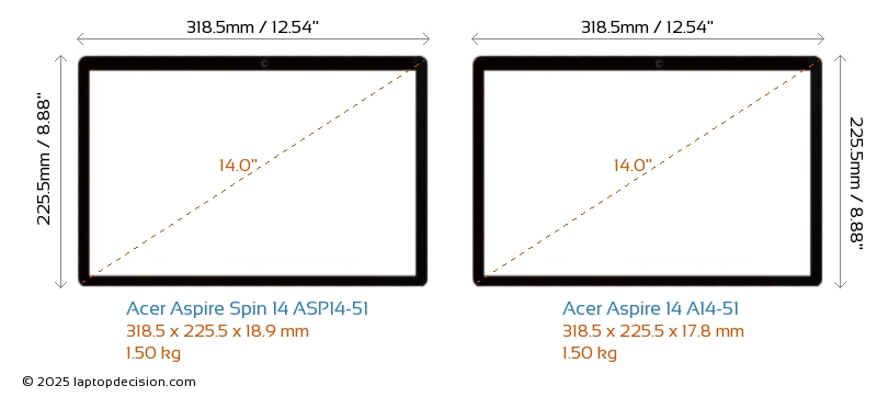 Thunderbolt Aspire Spin 14 ASP14-51 is equipped with Thunderbolt 4 port. Aspire 14 A14-51 does not have Thunderbolt port.