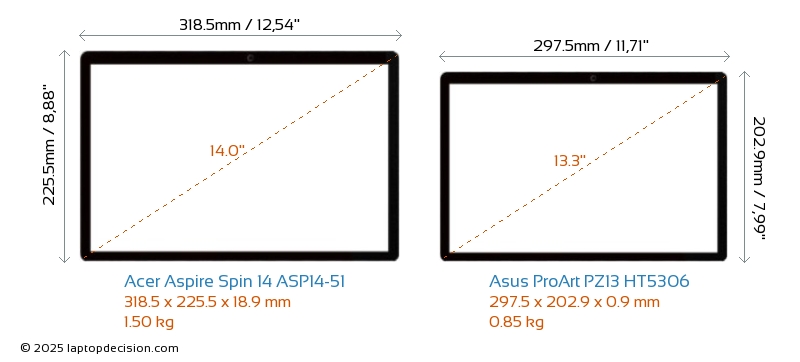 SD Card Reader ProArt PZ13 HT5306 is equipped with an SD Card Reader for easy access to memory cards. Aspire Spin 14 ASP14-51 does not have an SD Card Reader.