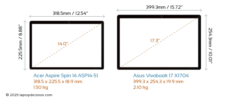 Thunderbolt Aspire Spin 14 ASP14-51 is equipped with Thunderbolt 4 port. Vivobook 17 X1704 does not have Thunderbolt port.