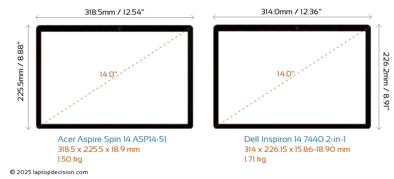 HDMIBoth Aspire Spin 14 ASP14-51 and Inspiron 14 7440 2-in-1 feature an HDMI port. Aspire Spin 14 ASP14-51 offers 1x HDMI 2.1, while Inspiron 14 7440 2-in-1 offers 1x HDMI 1.4.