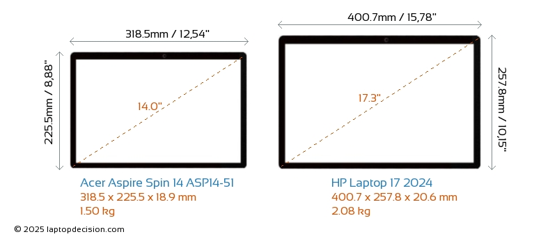 HDMIBoth Aspire Spin 14 ASP14-51 and Laptop 17 2024 feature an HDMI port. Aspire Spin 14 ASP14-51 offers 1x HDMI 2.1, while Laptop 17 2024 offers 1x HDMI 1.4.