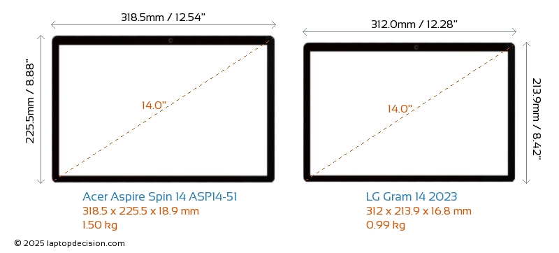 HDMIBoth Aspire Spin 14 ASP14-51 and Gram 14 2023 feature an HDMI port. Aspire Spin 14 ASP14-51 offers 1x HDMI 2.1, while Gram 14 2023 offers 1x HDMI 2.0.