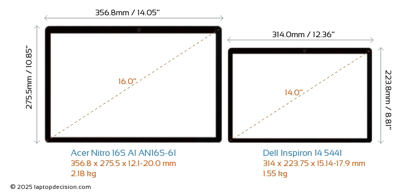 HDMI Nitro 16S AI AN16S-61 features an HDMI port (1x HDMI 2.1) for connecting to external monitors. Inspiron 14 5441 does not have an HDMI port.