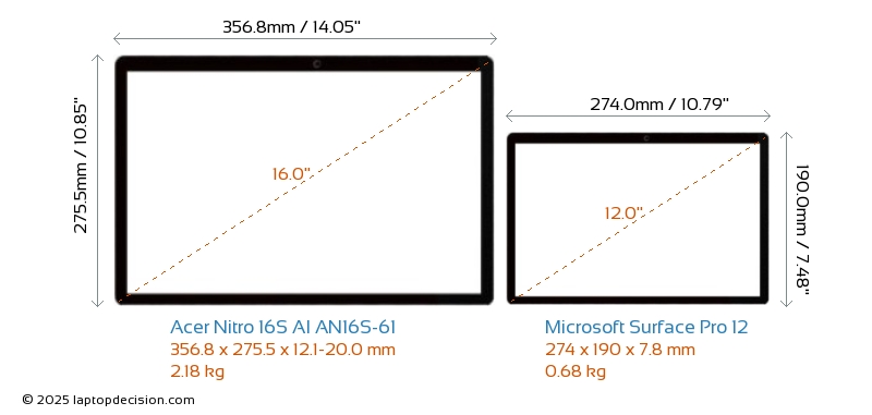 HDMI Nitro 16S AI AN16S-61 features an HDMI port (1x HDMI 2.1) for connecting to external monitors. Surface Pro 12 does not have an HDMI port.