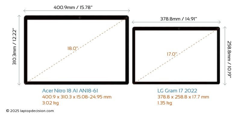 HDMIBoth Nitro 18 AI AN18-61 and Gram 17 2022 feature an HDMI port. Nitro 18 AI AN18-61 offers 1x HDMI 2.1, while Gram 17 2022 offers 1x HDMI 2.0.