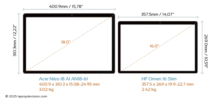 HDMIBoth Nitro 18 AI AN18-61 and Omen 16 Slim feature an HDMI port (1x HDMI 2.1) for connecting to external monitors.