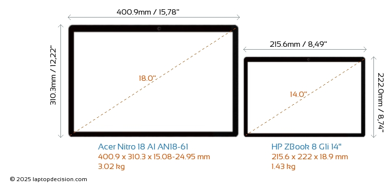 HDMIBoth Nitro 18 AI AN18-61 and ZBook 8 G1i 14" feature an HDMI port (1x HDMI 2.1) for connecting to external monitors.