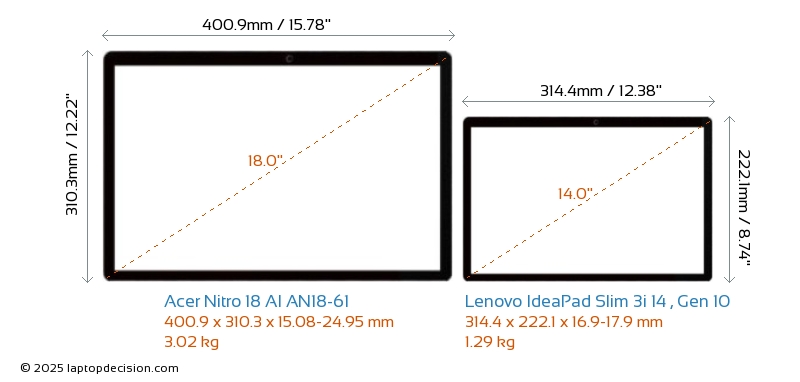 HDMIBoth Nitro 18 AI AN18-61 and IdeaPad Slim 3i 14 , Gen 10 feature an HDMI port. Nitro 18 AI AN18-61 offers 1x HDMI 2.1, while IdeaPad Slim 3i 14 , Gen 10 offers 1x HDMI 1.4.