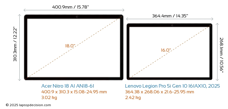 SD Card Reader Nitro 18 AI AN18-61 is equipped with an SD Card Reader for easy access to memory cards. Legion Pro 5i Gen 10 16IAX10, 2025 does not have an SD Card Reader.