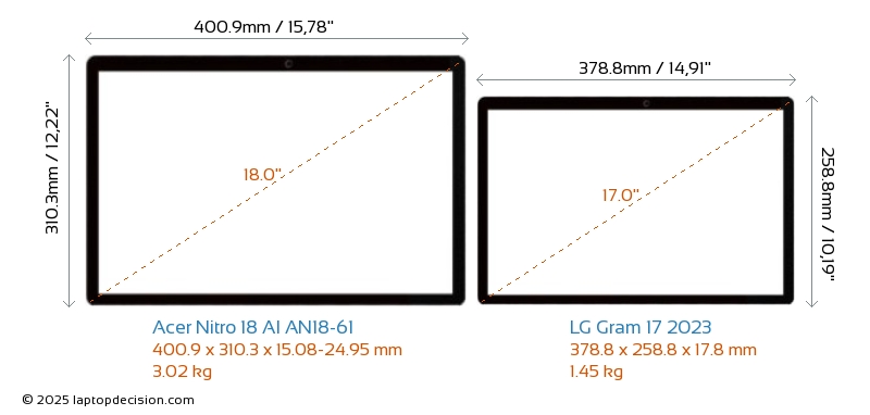 HDMIBoth Nitro 18 AI AN18-61 and Gram 17 2023 feature an HDMI port. Nitro 18 AI AN18-61 offers 1x HDMI 2.1, while Gram 17 2023 offers 1x HDMI 2.0.