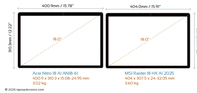 USBBoth Nitro 18 AI AN18-61 and Raider 18 HX AI 2025 feature 3x USB 3.2 USB-A ports.Both Nitro 18 AI AN18-61 and Raider 18 HX AI 2025 feature 2x USB 4.0 USB Type-C ports.