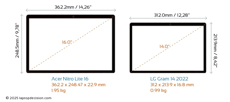 HDMIBoth Nitro Lite 16 and Gram 14 2022 feature an HDMI port. Nitro Lite 16 offers 1x HDMI 2.1, while Gram 14 2022 offers 1x HDMI 2.0.